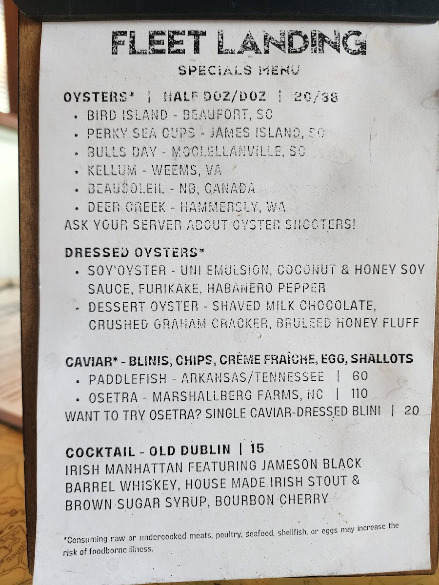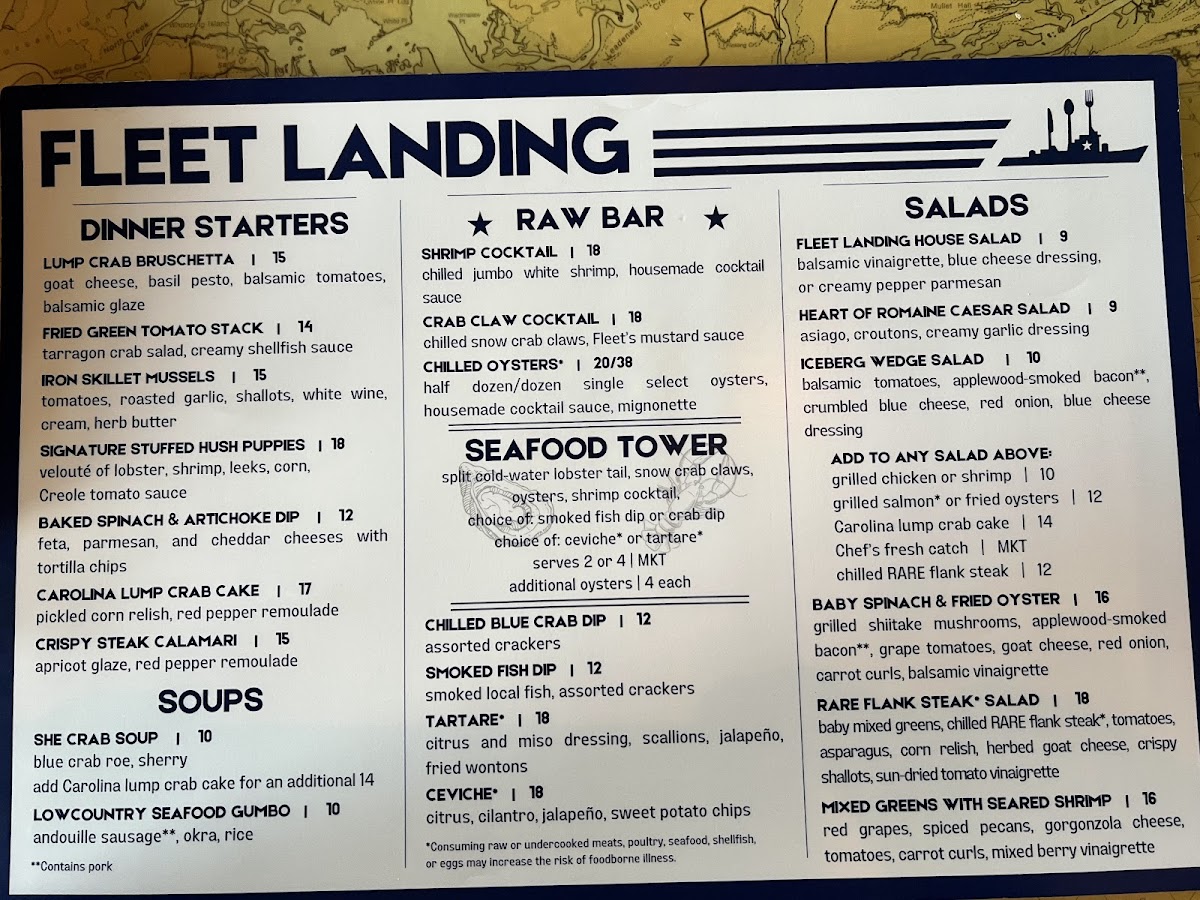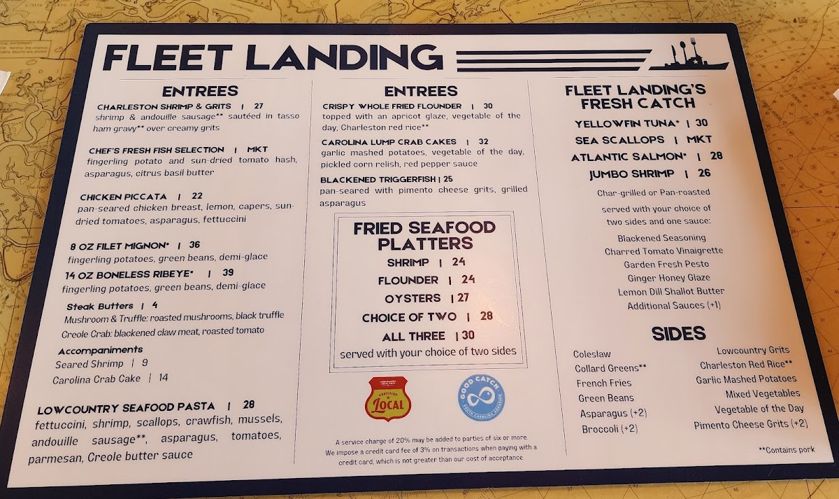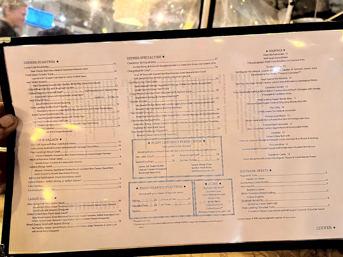 “ Why in charleston wanted to try indifferent seafood restaurant..so we landed on fleet landing. There was construction going on. So had to park and walk. And it was an eye sore. We get there. We were greeted right away. They have in door and out door seating. If the temperature permits...I suggest outdoor. Or at least near the windows. They have nice views. Right on the water. The service was nice. No complaints.. food was brought out pretty quick. And tasted good. Prices were roughly 20 to 30 pp...on average. For a entree... but overall. It was decent it was good. No real complaints. I definitely reccomend this spot of you a seafood lover. ”